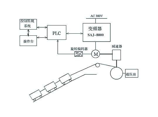 變頻器接入一制動(dòng)單元和制動(dòng)電阻,就可以滿(mǎn)足重車(chē)下行時(shí)的再生制動(dòng),實(shí)現(xiàn)平穩(wěn)的下行。井口還有一個(gè)液壓機(jī)械制動(dòng)器,類(lèi)似電磁抱閘,此制動(dòng)器用于重車(chē)靜止時(shí)的制動(dòng),特別是重車(chē)停在斜井的斜坡上,必須有液壓機(jī)械制動(dòng)器制動(dòng)。液壓機(jī)械制動(dòng)器受PLC和變頻器共同控制,機(jī)械制動(dòng)是否制動(dòng)受變頻器頻率到達(dá)端口的控制,起動(dòng)時(shí)當(dāng)變頻器的輸出頻率達(dá)到設(shè)定值,例如0.2Hz,變頻器A、B端口輸出信號(hào),表示電機(jī)轉(zhuǎn)矩已足夠大,打開(kāi)液壓機(jī)械制動(dòng)器,重車(chē)可上行;減速過(guò)程中,當(dāng)變頻器的頻率下降到0.2Hz時(shí),表示電機(jī)轉(zhuǎn)矩已較小,液壓機(jī)械制動(dòng)器制動(dòng)停車(chē)。緊急情況時(shí),按下緊急停車(chē)按鈕,變頻器能耗制動(dòng)和液壓機(jī)械制動(dòng)器同時(shí)起作用,使提升機(jī)在盡量短的時(shí)間內(nèi)停車(chē)。